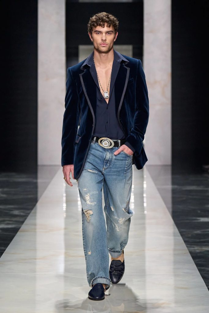 Consider the scene: a structured double-breasted velvet jacket layered over exaggerated ripped denim—an unexpected, almost theatrical clash of refinement and unrest.