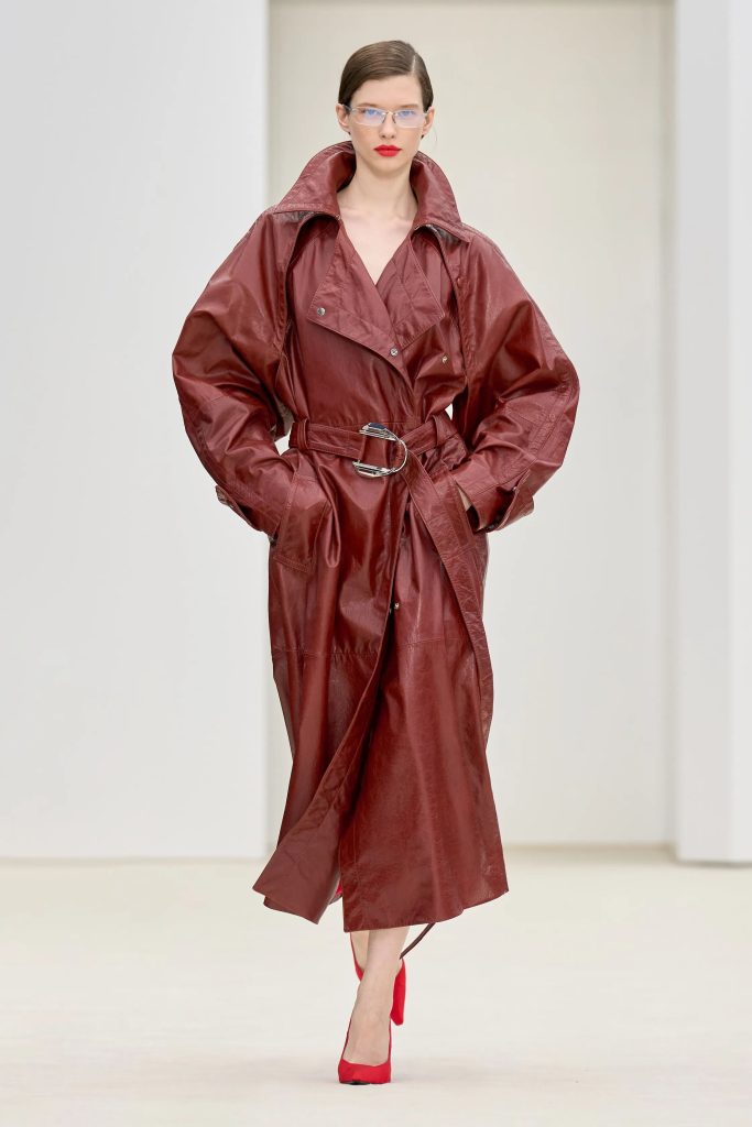 Over half the looks were in shades of white (butter, ivory, optical) to showcase the untreated, natural tones of the fabrics, complemented by rust and Ferrari’s signature magma red.