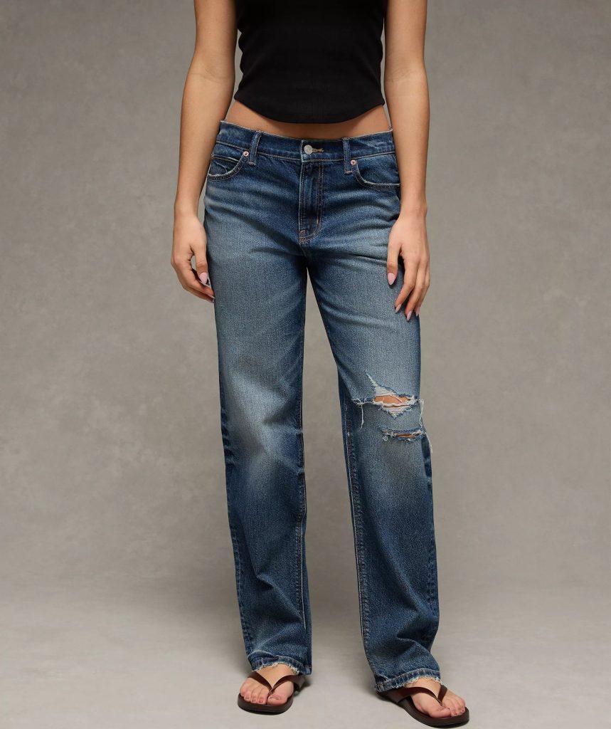 AE Strigid Low-Rise Baggy Straight Jeans ($59.69) – a not too baggy fit in a darker blue vintage wash with the fashionably less ripping