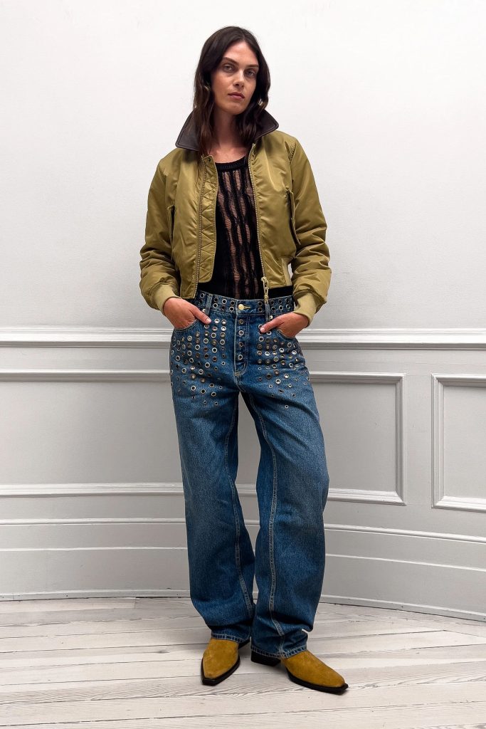 Other denim styles are more decorative with grommet details or an expressionist patchwork of metallic threads.