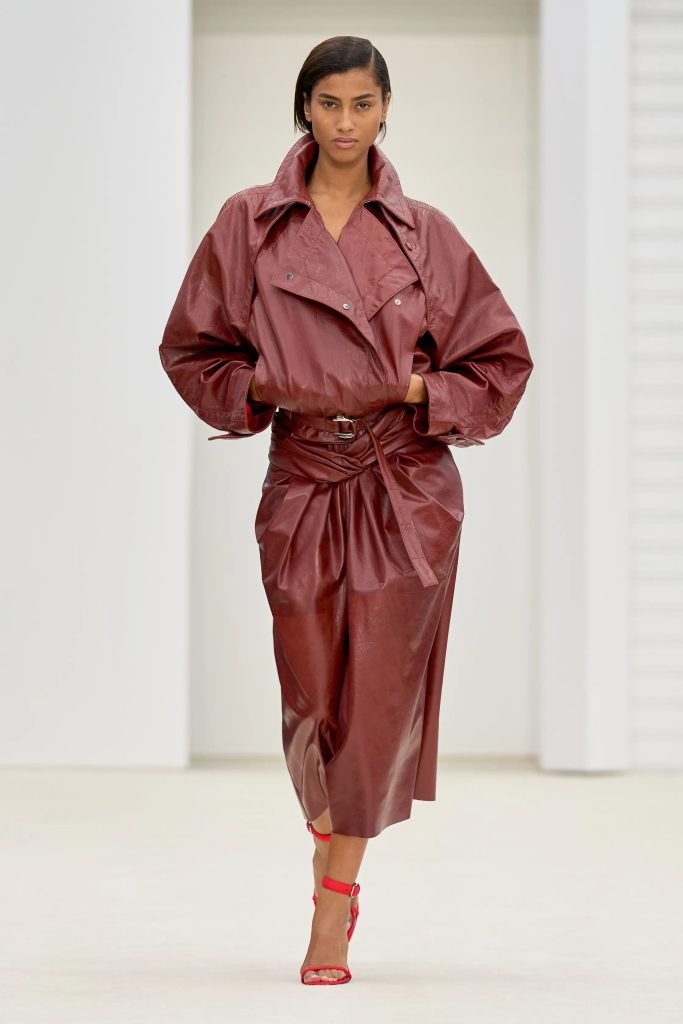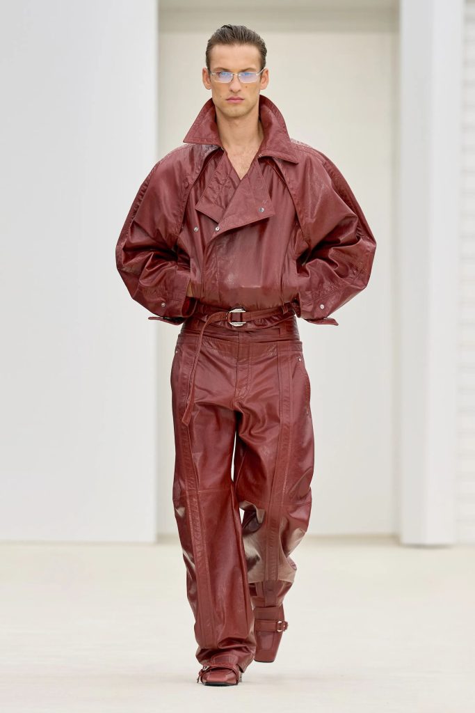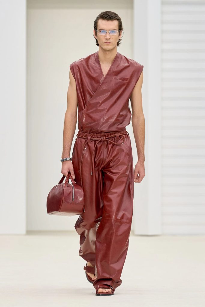 Over half the looks were in shades of white (butter, ivory, optical) to showcase the untreated, natural tones of the fabrics, complemented by rust and Ferrari’s signature magma red.