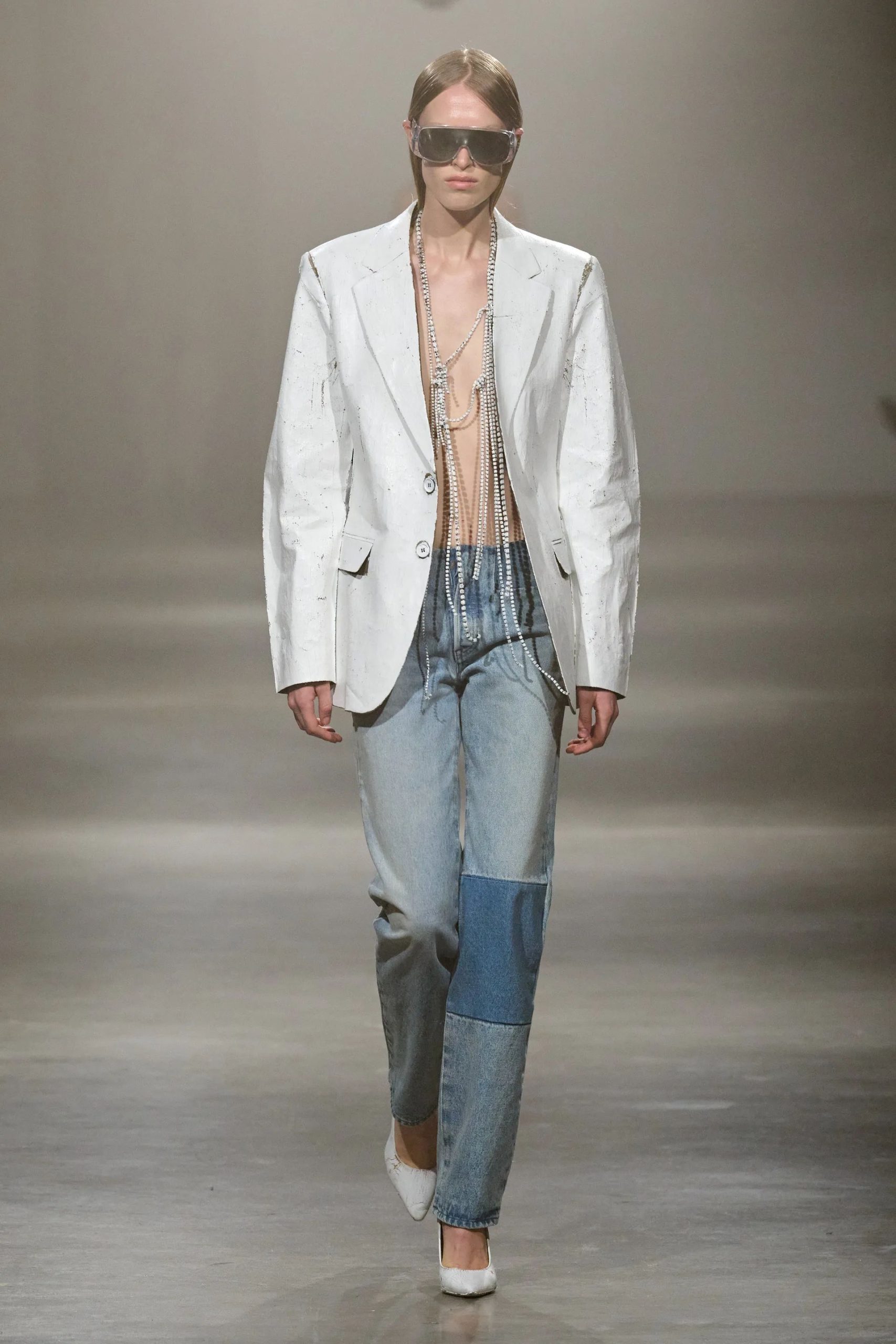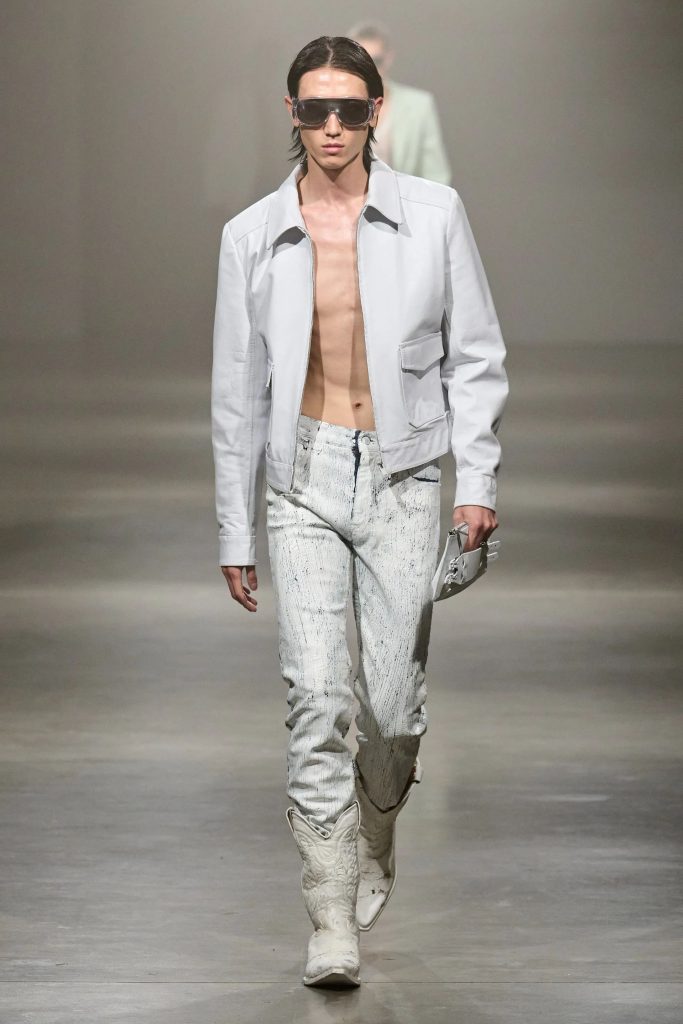 From DIY-inspired elements like knotted T-shirts to oversized accessories such as bold belts and statement handbags, the line evokes a sense of reimagined everyday wear. Iconic staples like suits and cowboy boots get fresh white paint treatments, while accessories—like oversized sunglasses and bracelet clutches—make bold statements.