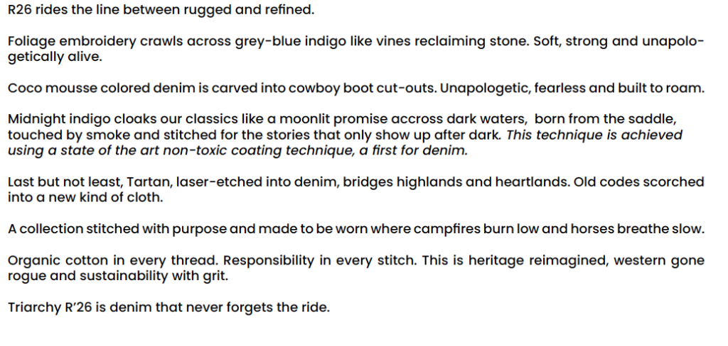 For Spring/Summer 2026, Triarchy continues its focus on responsible denim and modern silhouettes, combining fashion-forward shapes with the brand’s environmentally focused production methods.