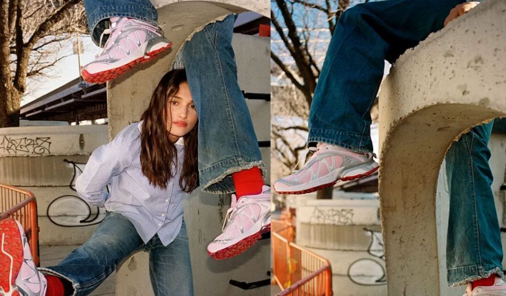 Sandy Liang and Salomon collaborated on the XT-Whisper sneaker, a design that seamlessly blends technical streetwear with Sandy Liang’s distinctive style. This collaboration marks their third partnership, introducing the XT-Whisper in a pink colorway inspired by the stainless steel elements of Sandy Liang’s store, accented with her signature pops of pink.