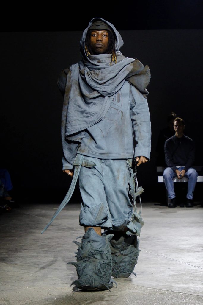So what exactly is Afrofuturism? It’s a mix of fantasy, technology, the future, and liberation. Meaning the brand combines futuristic and sculptural with natural, historical, and fantasy elements. Elongated proportions, warrior- or creature-inspired shapes, use of unusual textures, modularity, props, theatrical presentations.